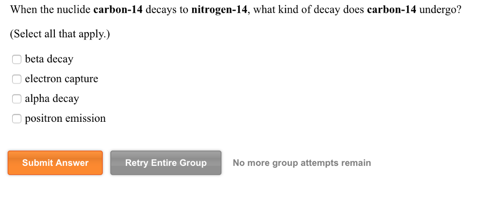 When the nuclide carbon-14 decays to nitrogen-14 what kind of decay does carbon-14 undergo. Which of the following are radioactive decay processes used to determine the age of samples. A scientist studying an unusual radioisotope had a 500 g sample of the substance in her lab.